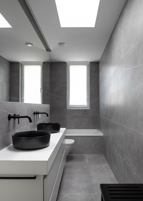 Para el pavimento general de la vivienda, se ha seleccionado el porcelánico Inari Gris Soft 90×90 de Keraben, una refinada colección inspirada en mármol de origen iraní. Una obra de arte natural, con un imponente color gris y vetas blancas delicadas. El acabado Soft aporta a Inari una apariencia diferencial que, junto con su relieve de mármol envejecido, reproduce fielmente el tacto sedoso y aspecto natural de este material sometido al paso del tiempo y el desgaste de su uso.