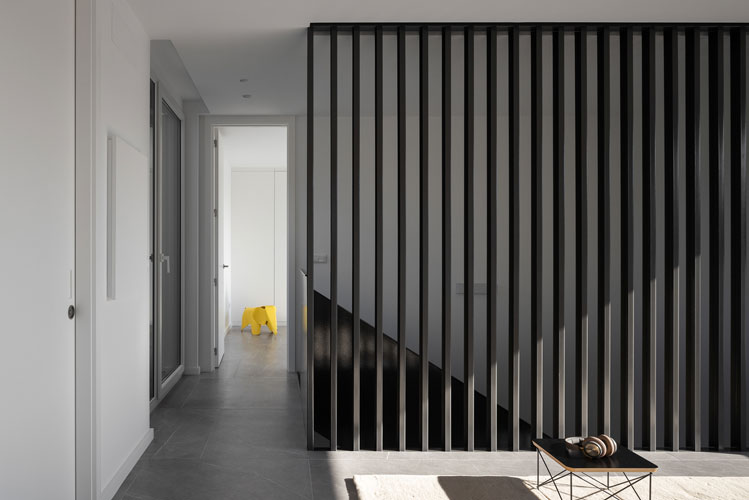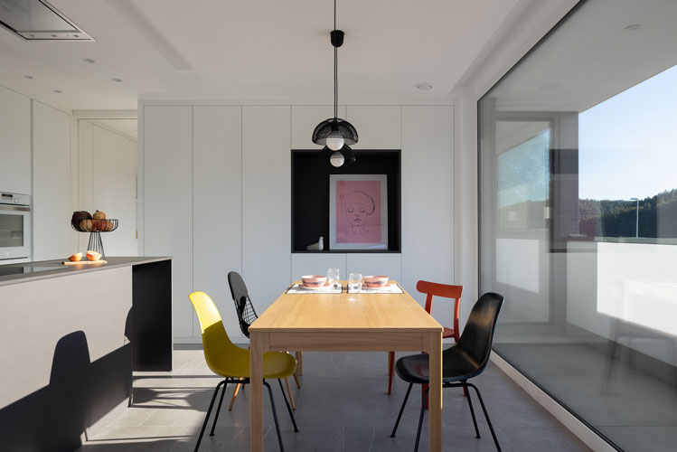 Un proyecto que parte de una pieza única y compacta, dada las dimensiones de la parcela, donde se aprecia perfectamente la diferencia entre la fachada norte, sin apenas huecos hacia la zona residencial, y la fachada sur, con grandes aberturas hacia el paisaje lejano, más amplias pero controladas por unas terrazas exteriores que generan cierta intimidad y aislamiento sonoro al tránsito de los vehículos y protección solar.